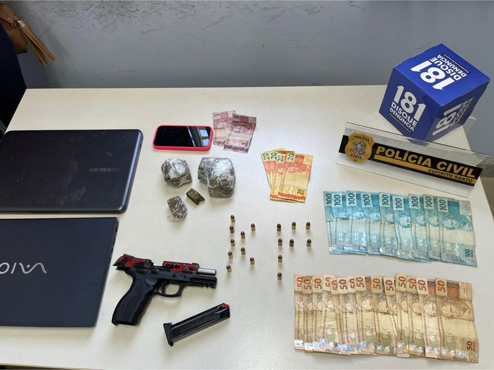 As equipes se dirigiram à residência da investigada, no Centro de Divino de São Lourenço, onde a mulher foi localizada. Com ela, foram apreendidos R$ 1.690,00 em espécie, dois notebooks, um aparelho celular e um pequeno pedaço de maconha.