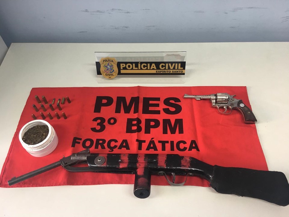 A Polícia Civil do Espírito Santo (PCES), por meio da Delegacia de Polícia (DP) de Guaçuí, com o apoio da Força Tática e da unidade canina (K9) da Polícia Militar do Espírito Santo (PMES), prendeu, na manhã desta terça-feira (27), um homem de 51 anos e o filho dele, de 25, durante uma operação realizada no Bairro Lagoa, em Guaçuí. Durante a ação, foram apreendidas duas armas de fogo e uma quantidade de maconha.