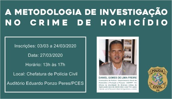 Estão abertas as inscrições para a palestra “Metodologia de Investigação no Crime de Homicídio”, que ocorrerá no próximo dia 27, no auditório da Chefatura de Polícia, em Vitória. A capacitação será ministrada pelo comissário de Polícia Civil do Estado do Rio de Janeiro (PCE-RJ), Daniel Gomes de Lima, que tem 32 anos de experiência na área.