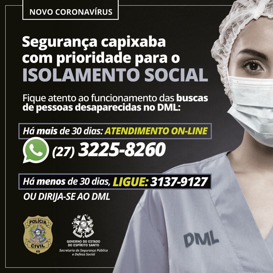 Para os casos de desaparecimentos há menos de 30 dias, Lugão orienta que os familiares liguem para (27) 3137-9127 ou dirijam-se ao DML.