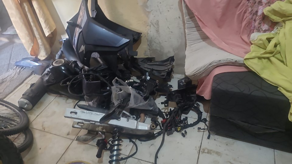 Durante a abordagem, o suspeito declarou que recebia dinheiro para guardar motocicletas na casa e que outra pessoa seria responsável pela desmontagem e posterior retirada das peças. No entanto, duas motocicletas completamente desmontadas, ambas com restrição de furto, foram localizadas.