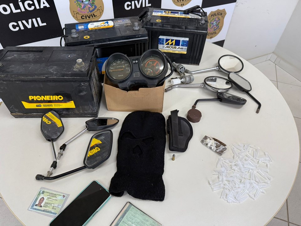 Na operação, os policiais localizaram diversos objetos de procedência suspeita e materiais ilícitos. Entre os itens apreendidos estão um coldre para revólver; uma munição calibre .32; uma balaclava; diversos pinos de cocaína vazios; porções de maconha; várias peças de motocicletas, incluindo retrovisores, lâmpadas de farol, um painel de moto e três baterias automotivas; um dichavador de maconha; um celular da marca Motorola; um cartão de alimentação e um cartão de conta corrente em nome de terceiros.