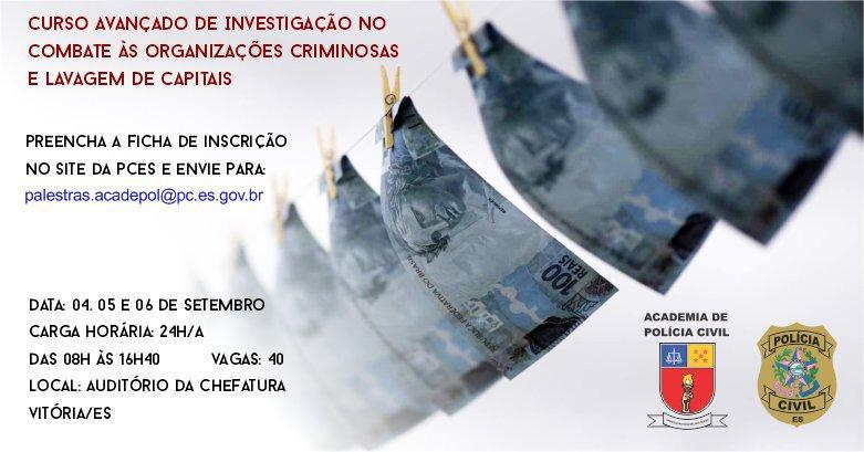 Estão abertas as inscrições para o Curso Avançado de Investigação no Combate às Organizações Criminosas e Lavagem de Capitais. Todas as categorias da Polícia Civil (PC) podem participar da formação que ocorrerá nos dias 04, 05 e 06 de setembro, das 08h às 16h40, no auditório da Chefatura da PC. 40 vagas foram oferecidas para a formação, que terá carga horária de 24h.