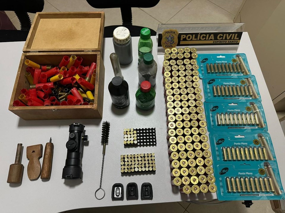 Na residência e em um celeiro anexo, os policiais civis localizaram e apreenderam 223 munições intactas dos calibres .357, .380 e 12; uma mira de precisão do tipo Red Dot para rifles; três prolongadores de carregador para pistola; além de diversos materiais utilizados para a recarga de munições, como pólvora, espoletas, chumbos esféricos e cartuchos deflagrados.