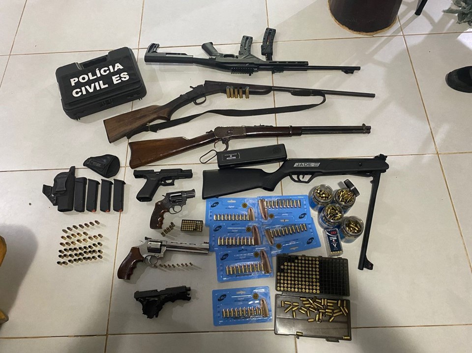 Durante as buscas, foram encontradas pela equipe da PCES oito armas, munições, além de carregadores, acessórios e materiais relacionados ao armamento. O suspeito não foi encontrado.