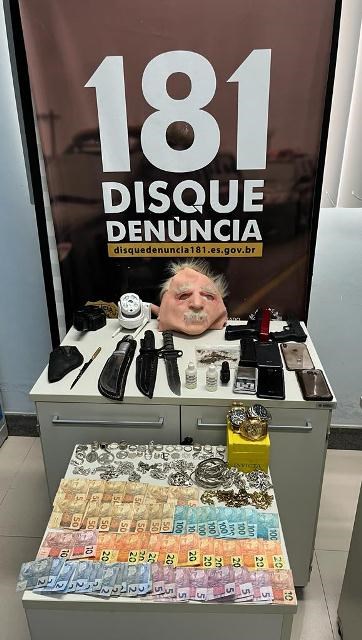 No local, os policiais encontraram joias, relógios, celulares, dinheiro, uma máscara imitando o rosto de um idoso, ácido para teste de ouro e dois simulacros de arma de fogo, do tipo pistola, além de outros objetos. O investigado foi preso em cumprimento de mandado de prisão. O outro homem foi liberado e o Conselho Tutelar foi acionado para tomar as medidas cabíveis em relação às crianças.