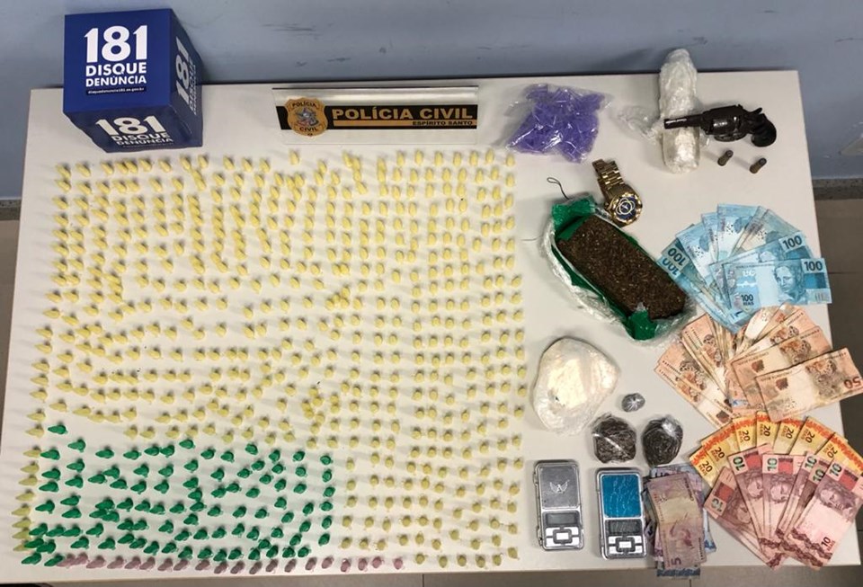No final da tarde dessa quinta-feira (10), a equipe da Delegacia de Polícia de Guaçuí realizou uma operação no bairro Vale do Sol, que resultou na apreensão de 618 pinos de cocaína, uma porção de pasta base de cocaína, um tablete de maconha, dois pedaços de maconha, uma arma de fogo calibre .44, duas munições do mesmo calibre, duas balanças de precisão, material para embalar drogas e aproximadamente R$ 2.000,00 em espécie.