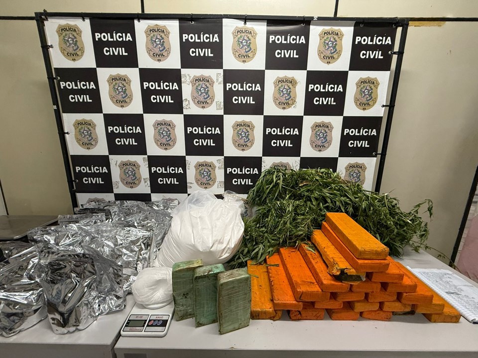 Após monitoramento e diligências em campo, os policiais localizaram o imóvel e, diante de fundada suspeita, realizaram buscas. Com o apoio da equipe do canil da PMES, foram apreendidos 26 quilos de maconha, 03 quilos de crack, 20 quilos de insumos para o preparo de cocaína e três balanças de precisão.