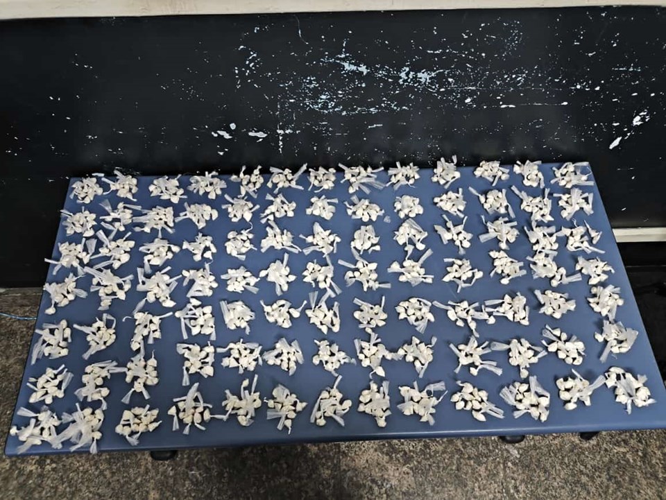 Em seguida, as equipes realizaram uma nova incursão, desta vez em uma área de mata. Durante a operação, os policiais localizaram enterrados 1 quilograma de crack prensado e 910 pinos de cocaína prontos para o tráfico.