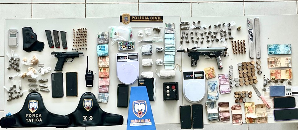 Ao todo, foram apreendidos uma pistola calibre 9mm, três carregadores, uma submetralhadora caseira cal .380, 50 munições cal .380, 48 munições 9mm, um rádio comunicador, cinco balanças de precisão, porções de maconha, crack e cocaína, 98 munições de diferentes calibres, material para embalo de entorpecentes, um coldre e o montante de R$ 22.631,70 em espécie.