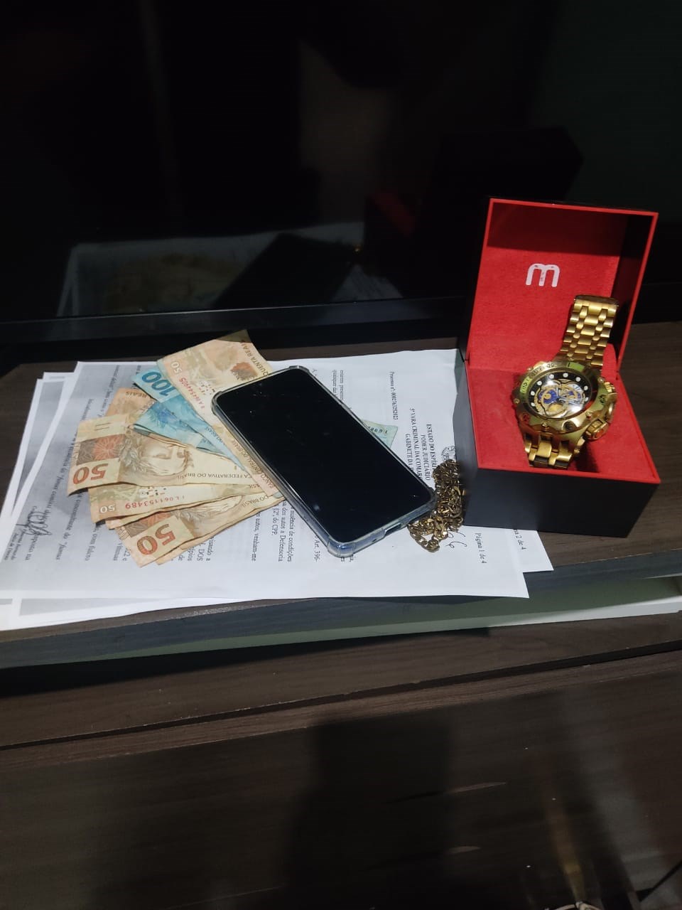 As equipes se dirigiram ao endereço do suspeito, mas ele não foi localizado no imóvel. A companheira dele informou às equipes que o homem não tem paradeiro fixo por medo de ser preso. Na casa, foram apreendidos a quantia de R$ 1.050,00 em espécie, um relógio dourado, aparelho celular, e dois cordões dourados que são do procurado.