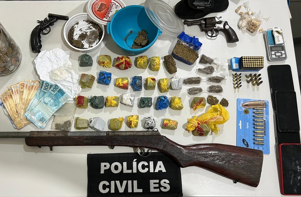 Durante a ação, foram apreendidos diversos materiais, entre eles um revólver calibre 32, uma espingarda de fabricação caseira calibre 12, uma garrucha calibre 22 com dois canos, cerca de 30 gramas de crack, aproximadamente 885 gramas de maconha, 20 gramas de cocaína, 61 munições calibre 22 e 18 munições calibre 32, uma balança de precisão, centenas de embalagens para acondicionamento de drogas e R$ 1.230,00 em dinheiro proveniente da venda de entorpecentes.