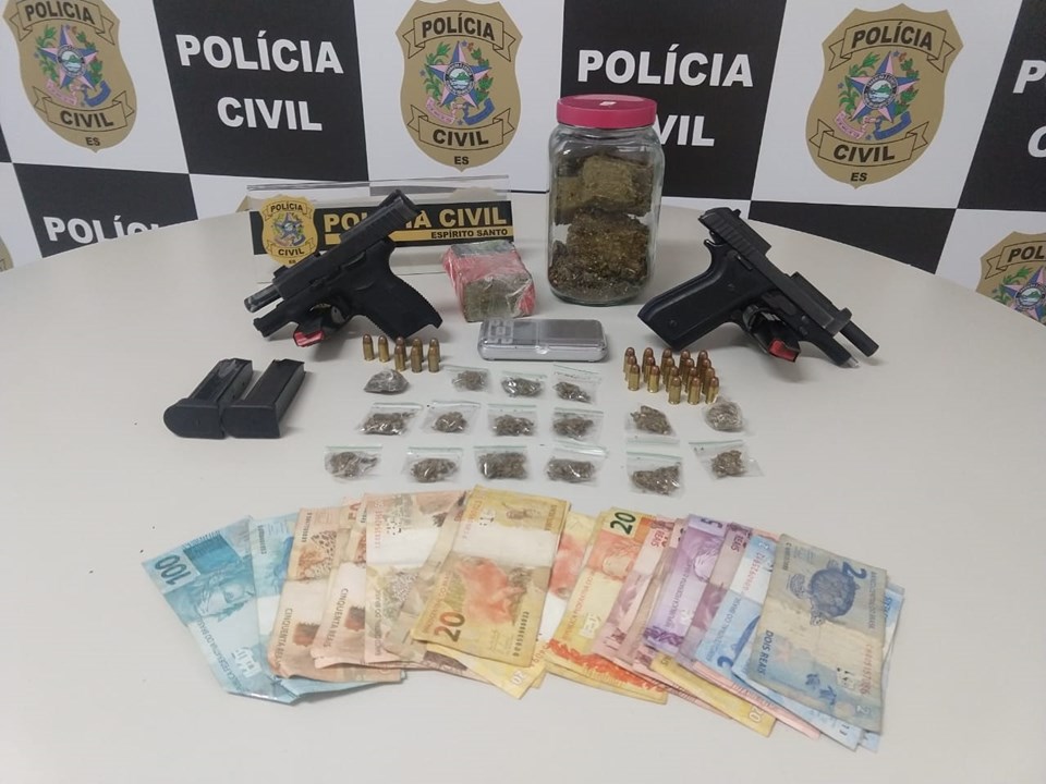 O trio J.N.S., L.G.E.S.M. e H.V.L.F. foi autuado durante o cumprimento de um mandado de busca e apreensão na residência de J.N.S. O delegado responsável pela operação, André Jaretta, titular do Departamento de Homicídios e Proteção à Pessoa (DHPP), informou que a equipe apreendeu no local 600g de maconha, 16 buchas de maconha, quatro carregadores de pistola, uma arma de calibre .380, munições, uma balança de precisão, além de 893 reais em espécie.