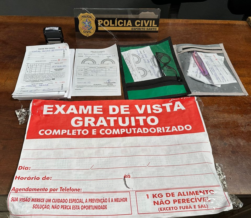 Durante a ação, foram apreendidos receituários e um carimbo com o nome do suspeito, a designação “optometrista” e uma numeração de registro vinculada a uma associação da categoria.