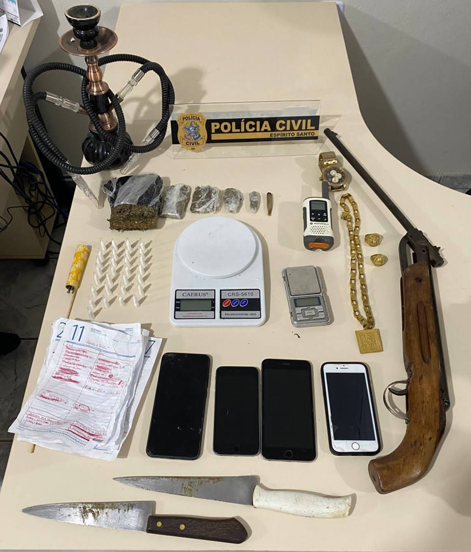 Também foram aprendidas duas facas com resíduo de maconha, além de um rádio comunicador, um artefato sinalizador, uma espingarda de pressão, joias, um narguilé, sete folhas de agenda contendo anotação do tráfico de drogas e quatro aparelho de celulares.