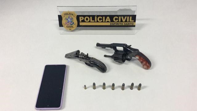 Uma equipe da Polícia Civil foi ao local e encontrou o suspeito, que chegava na residência dele. Os policiais entraram na casa com o suspeito e, no guarda-roupa, encontraram uma garrucha calibre.22, com uma munição. Em seguida, foram à residência da mãe do suspeito, onde ele escondia uma arma de fogo, um revólver calibre .32, com seis munições.