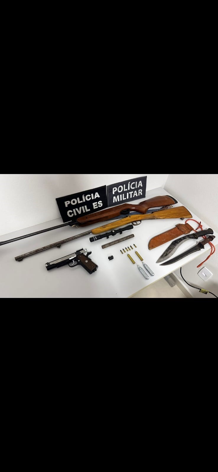 Durante a ação que culminou na prisão, os policiais também apreenderam: uma espingarda, seis munições, uma espingarda socadeira, uma pistola de gás calibre 4,5 mm, dois cilindros de gás para pistola, uma luneta QGQ 4x20, um canhão artesanal e duas munições calibre 36.