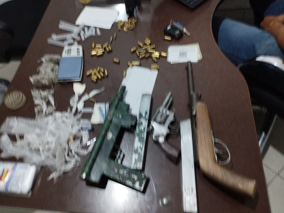 Em seguida, foram efetuadas buscas nas imediações. Foram encontradas e apreendidas mais duas armas de fogo, sendo um revólver calibre .32 e uma garrucha calibre .22, além de diversas munições de vários calibres, uma porção de cocaína, nove buchas de maconha, balanças de precisão, entre outros materiais utilizados no tráfico de drogas.