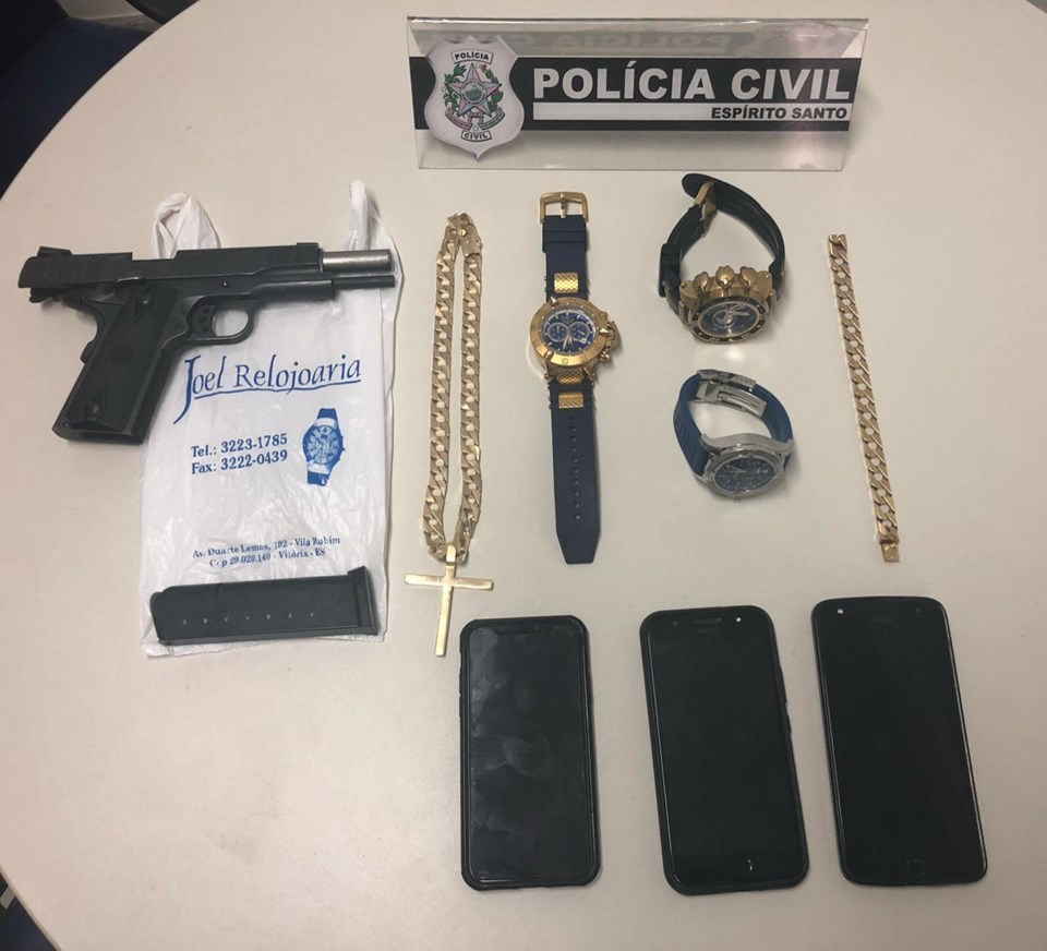 No momento da prisão P.C.R. estava usando o relógio da vítima, já M.L.R. estava com a pulseira e T.D.M. estava usando um cordão de ouro avaliado em R$ 50 mil. “ Como ele é filho do dono de uma joalheria, localizada no Centro de Vitória, nós suspeitamos que ele pudesse estar agindo por intermédio do pai e, por isso, fomos até o estabelecimento. No local, nós apreendemos uma grande quantidade de joias de ouro sem nota fiscal. As investigações irão continuar com intuito de confirmar outros envolvidos no crime”, explica.