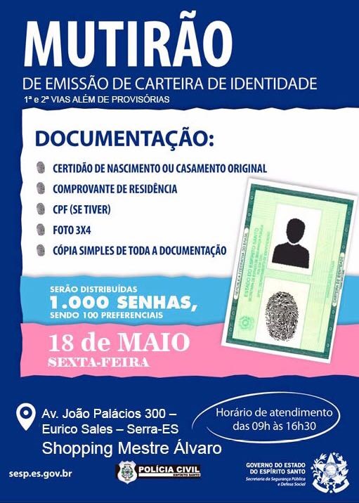 Nesta sexta-feira (18), acontecerá mais uma edição do mutirão para emissão de carteiras de identidade promovida pela Polícia Civil, por meio da Superintendência de Polícia Técnico-científica (SPTC). Desta vez, a ação será realizada no Shopping Mestre Álvaro, em Serra. O atendimento acontece das 9h às 16h30.
