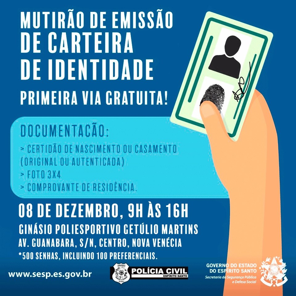 A Polícia Civil, por meio da Superintendência de Polícia Técnico-Científica (SPTC), realizará, nesta sexta-feira (08), mais um mutirão para emissão de carteiras de identidade. Os beneficiados serão os moradores de Nova Venécia. O mutirão acontecerá no ginásio poliesportivo Getúlio Martins, das 9h às 16h.