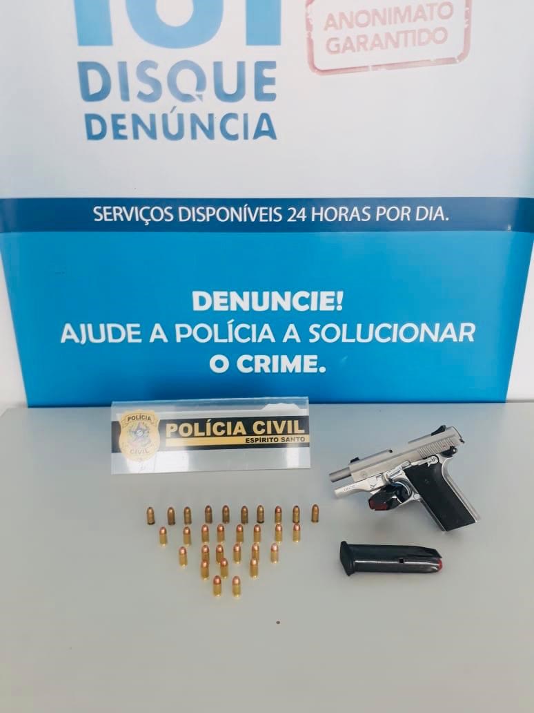 E.J.S., no momento da prisão, portava uma pistola calibre .380 e dois carregadores com 29 munições intactas. Por isso, além do mandado de prisão preventiva, ele também foi autuado em flagrante pelo crime de porte ilegal de arma de fogo.