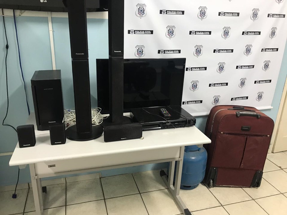 A equipe da Delegacia Especializada de Infrações Penais Outras (Dipo) de Aracruz recuperou nessa quarta-feira (02) diversos objetos que haviam sido furtados no bairro Coqueiral de Aracruz, em novembro de 2017. Entre eles estão dois televisores, um home theater, uma mala de viagem, um botijão de gás e um console de videogame. Os objetos foram encontrados na residência de M.S.S., de 35 anos, na região das aldeias Irajá e Caeiras Velha, no município.