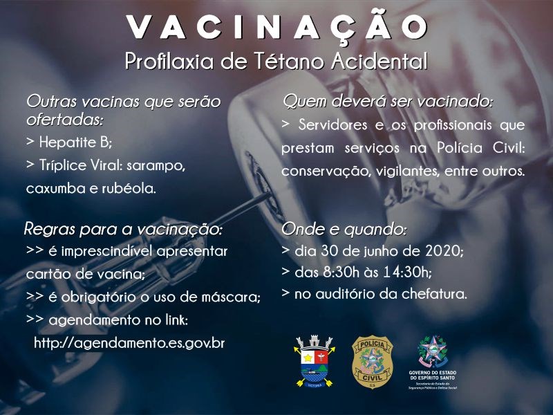 Na próxima terça-feira (30), policiais civis, funcionários da conservação, vigilantes, estagiários e demais prestadores de serviços à Polícia Civil poderão se vacinar contra Tétano Acidental, Hepatite B e o reforço da Tríplice Viral [sarampo, caxumba e rubéola]. A campanha de vacinação acontecerá das 8h30 às 14h30, no auditório da Chefatura de Polícia, em Vitória.