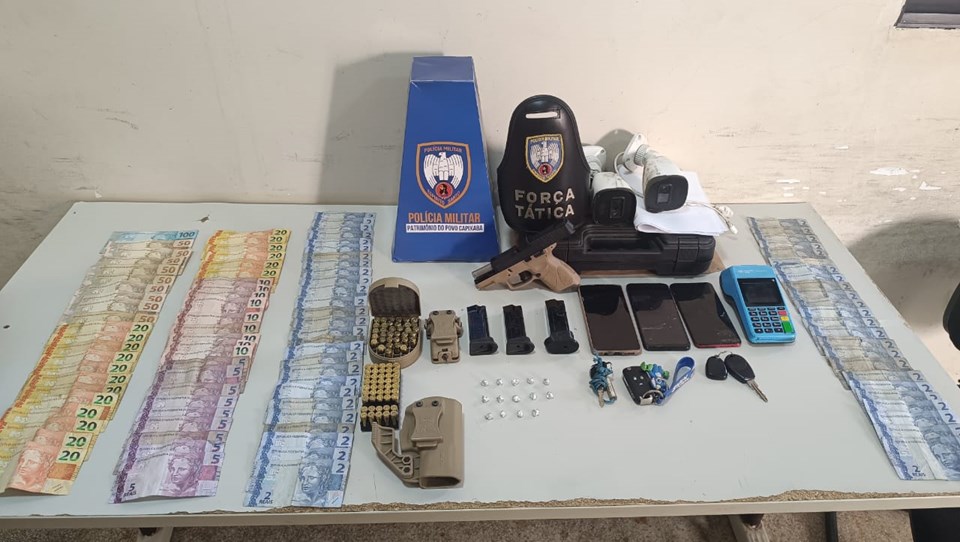 Ainda no bairro Aeroporto, um homem de 30 anos foi preso, apontado como gerente de cocaína da organização. No local, foram apreendidas uma pistola, 14 pedras de crack, 80 munições, uma maleta com duas câmeras de monitoramento, um coldre, três carregadores de pistola, automóveis, aparelhos celulares, além de R$ 1.142,00 em espécie.