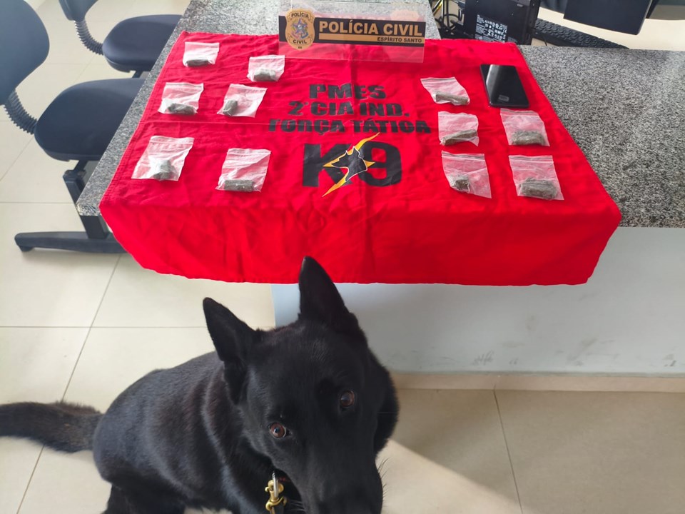 Durante as buscas na residência do investigado, localizadas no bairro José Valim, em Afonso Cláudio, as equipes contaram com o apoio do cão de faro “Black”, que localizou 11 pedaços de maconha, totalizando aproximadamente 90 gramas, escondidos embaixo do fogão.