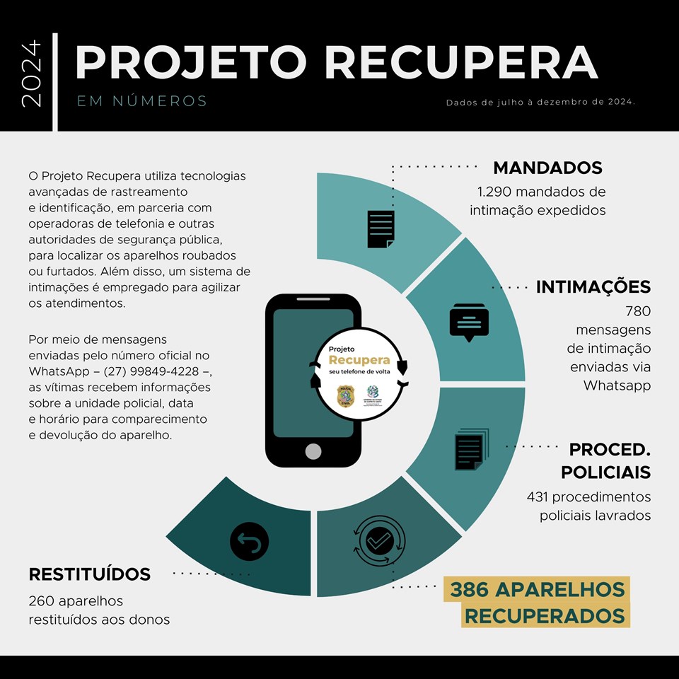A Polícia Civil do Espírito Santo (PCES), por meio da Superintendência de Polícia Regional Metropolitana e da Superintendência de Inteligência e Ações Estratégicas, apresentou, nesta segunda-feira (03), o balanço das atividades do Projeto Recupera. Entre julho e dezembro de 2024, foram recuperados 386 aparelhos celulares roubados e furtados.