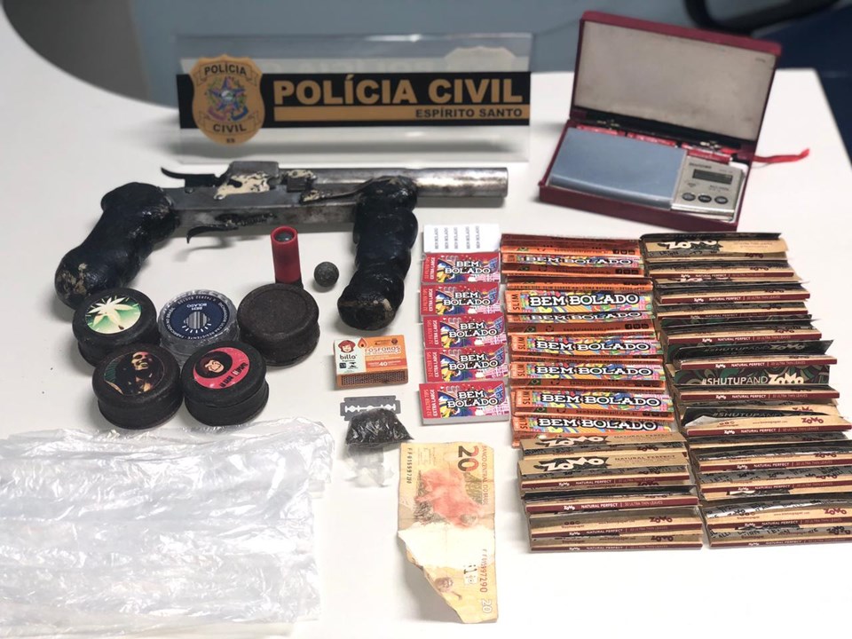Na residência do detido, foi encontrada e apreendida uma arma de fabricação artesanal calibre 12, devidamente municiada com munição. Dentro de uma mochila, foram encontradas diversas embalagens com papel de seda, cinco “dichavadores”, uma porção de substância que aparentava ser maconha, material para embalo das drogas, uma balança de precisão e R$ 20 em espécie.