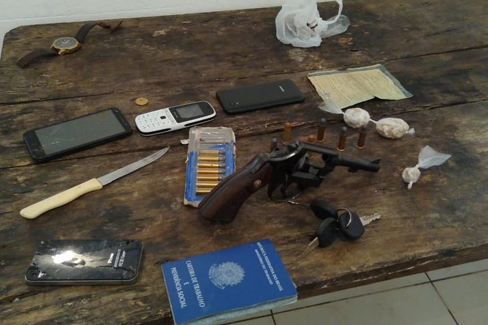 Durante as buscas, foram encontrados e apreendidos um revólver calibre 38, com o tambor municiado com seis munições, um "blister" contendo mais munições do mesmo calibre, seis celulares, 60 pedras de crack embaladas de forma pronta para venda e R$ 60 em espécie.